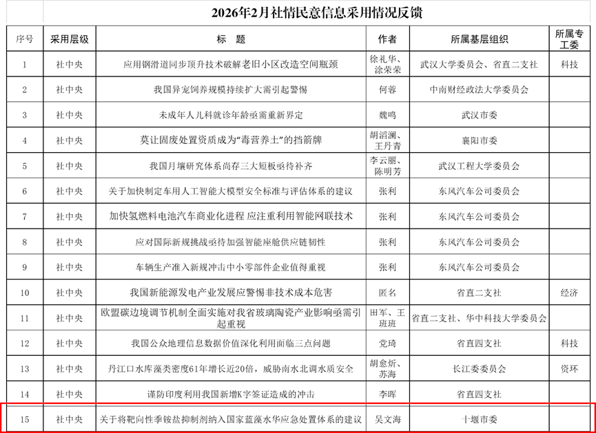 近日,从九三学社湖北省委员会获悉,我校化学与环境工程学院副教授、九三学社太阳集团城网站2018支社社员吴文海撰写的社情民意信息《关于将靶向性季铵盐抑制剂纳入国家蓝藻水华应急处置体系的建议》被九三学社中央委员会采用。这是我校教师在社情民意信息工作中实现社中央层面的又一突破,标志着我校在服务国家战略需求和地方生态环境治理方面的建言献策能力持续提升。