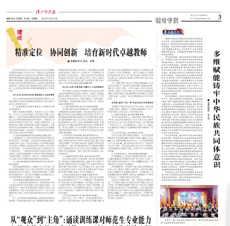 铸牢中华民族共同体意识是新时代党的民族工作主线,也是高校落实立德树人根本任务的关键着力点。我校通过系统化的文化浸润、多元化的实践赋能、专业化的队伍建设以及开放化的校地协同,构建起全员参与、全过程贯穿、全方位覆盖的铸牢教育体系,多维赋能构筑铸牢中华民族共同体意识教育。